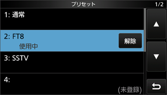 FT8を、より快適に楽しんでいただくための簡単設定を備えています。[プリセット]画面からFT8を選ぶだけで、必要な項目を一括で設定することが可能です。さらに、FT8から通常モードに戻る際も[通常]を選ぶだけ。スムーズな切り替えが可能です。