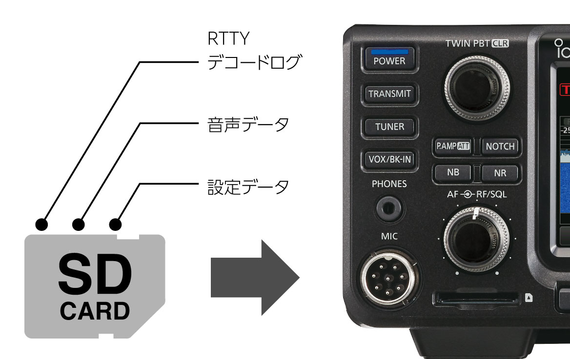 交信の録音、RTTYデコードのログ、表示画面のキャプチャー画像等をSDカードに保存できます※。また、ボイス送信用に音声の保存も可能。さらに無線機の設定も保存できるので、オペレーターが代わってもSDカードを差し替えるだけで、各自がすぐに好みのセッティングで運用できます。
