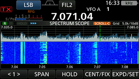 ウォーターフォール表示により、受信信号の履歴を時系列で確認したり、スペクトラムスコープだけでは判別しにくい微弱な信号を視認したりすることが可能。さらに、スペクトラムスコープと同時に表示することで、バンドの状況、空き周波数の情報を、より詳細に知ることができます。高性能なスペクトラムスコープとウォーターフォール表示により、微弱なDX局の信号を見逃すことなく、IC-7300MK2の受信性能を最大限に引き出し、交信の可能性を高めます。