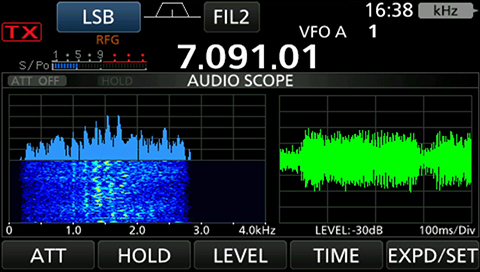 オーディオスコープを搭載しているので、送受信音のFFTスコープ、オシロスコープの表示が可能です。相手局の送信波の変調特性や自局のマイクコンプレッサー効果確認、受信音のスペクトラム表示によるフィルター幅やノッチの特性を目で確認するなど、多彩に活用できます。さらに、オシロスコープではCWのキーイング波形を視認することもできます。