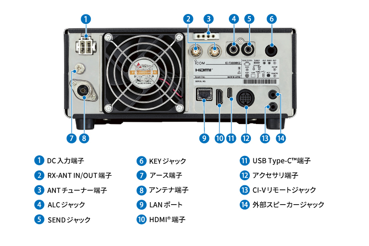 USB端子(CI-V、オーディオ、IF出力)、ALCジャック、SENDジャックなど、インターフェースが充実しています。リモート操作、リニアアンプの接続等、より高度な運用を求めるユーザーのニーズにも対応しています。