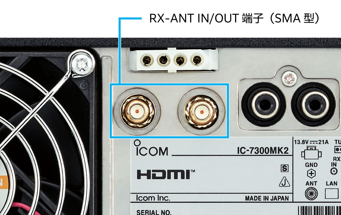 IC-7300MK2はRX-ANT IN/OUT端子(SMA型)を装備しています。これにより、アンテナ特性を生かした高度な受信が可能になります。また、外付けのバンドパスフィルターやプリアンプなども接続することができます。