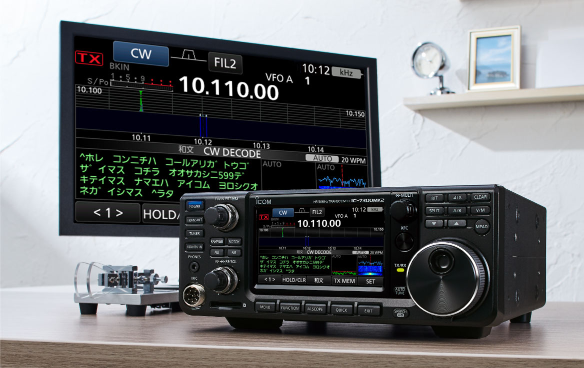 IC-7300MK2では、ユーザーから評価の高い機能・性能を受け継ぎ、欧文/和文のCWデコーダーや外部ディスプレイ出力端子(HDMI®)を搭載。また、USB Type-C™端子やLANポート、受信用アンテナ端子を採用、目的信号の了解度を向上させるAPF(オーディオピークフィルター)機能も装備。そのほか、RMDR/フェースノイズ特性は従来機から共に12dBの大幅改善を達成、発熱の低減も実現しています。これにより、さらに充実したHF帯の運用を楽しめるようになりました。HF初心者から上級者まで、幅広いユーザーのニーズに応える、進化したトランシーバーです。