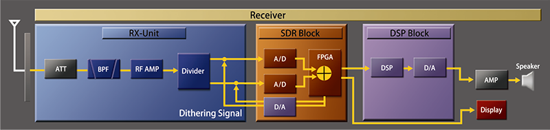 上位のSDRモデルで採用された高分解能A/DコンバータとFPGA素子を搭載すると共に2個のA/Dコンバータを使用してデジタル変換処理を行うツインA/Dコンバータ回路構成は、過負荷によるA/Dコンバータのオーバーフローを軽減しブロッキング特性を改善しています。また、デジタル変換前のアナログ信号にランダムノイズを加え、A/Dコンバータによるデジタル変換時の量子化誤差を最小化することで歪を抑え、IM(Intermodulation)特性を改善するディザリング技術を採用するなど、SDR