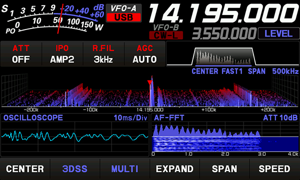 ディスプレイのMULTI表示はバンドスコープ表示に加え、オシロスコープとAF-FFTのオーディオスコープを同一画面に表示させます。これにより、運用中に受信バンドをモニターしながら同時に受信音のスペクトラムを表示するAF-FFT機能で相手局の送信電波のオーディオ特性を見ることや、受信部のIFフィルターや混信除去機能を調整する際にも、その効果を視覚的に確認することができるので、コンテストなどにおいて瞬時に全体のコンディションを把握することができます。