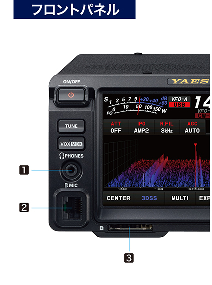 大型5インチのタッチパネルディスプレイによる直感的な操作を実現すると共に、実際の運用において重要な機能はVFOダイヤルを中心に配置され、通信機としての操作性を重視したパネルレイアウトになっています。