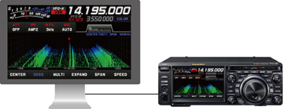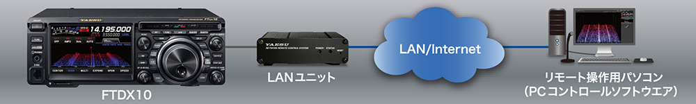 FTDX10にLANユニット(別売:SCU-LAN10)を繋いでLANやインターネットに接続することで、遠隔地からトランシーバーのリモート運用を行うことができるPCリモートコントロールシステム。リモート運用ではトランシーバーの基本操作の他、多彩なスコープ表示に対応しており快適な運用ができます。遠隔地からのリモート運用以外にも家庭内LANに接続してシャックから離れた場所からバンドの状況を大型ディスプレイに映し出してモニターすることが可能になります。