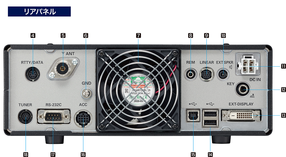 リアパネルに3つのUSBポート(Aタイプx2、Bタイプx1)を装備していますので、マウスを接続したトランシーバーの操作やキーボードを接続した文字の入力などに使用することができます。