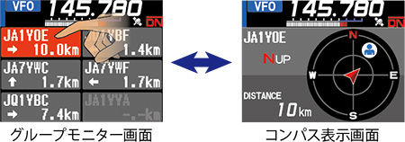 の場合には、すべての音声を受信することができます。 同じDG-ID番号に設定しているメンバーが、通信範囲内にいるかどうかを自動的にチェックしてコールサイン毎に表示したり(最大24局)、特定のコールサインを選択すれば、コンパス表示画面にリアルタイム表示することができます。