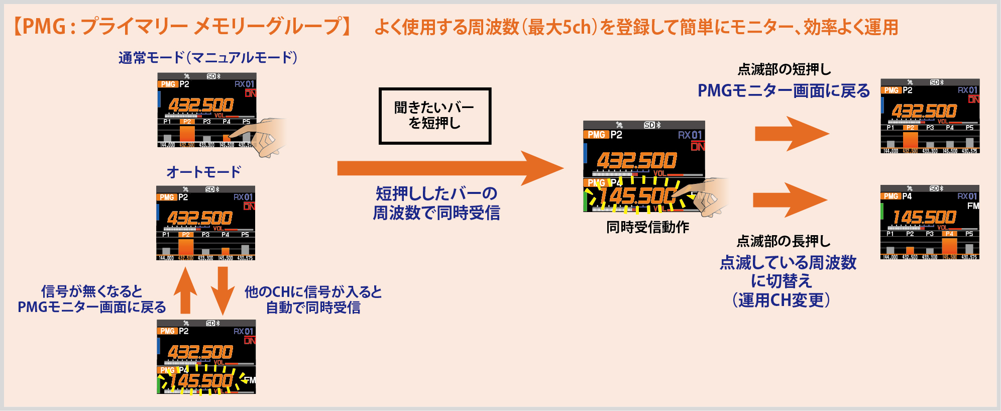 『PMG』 キーのワンプッシュで、VFO、メモリーチャンネルに関係なくモニターしたい複数の周波数(最大5チャンネル)をPMGグループに登録することができます。その後は、『PMG』 キーを押すだけで登録チャンネルの受信状態を画面にバーグラフで表示します。オートモードでは、運用チャンネル以外の登録チャンネルの信号が入ると自動でデュアル受信になります。モニター画面やデュアル受信画面からの運用チャンネルの切り替えもタッチ操作で簡単に行うことができます。